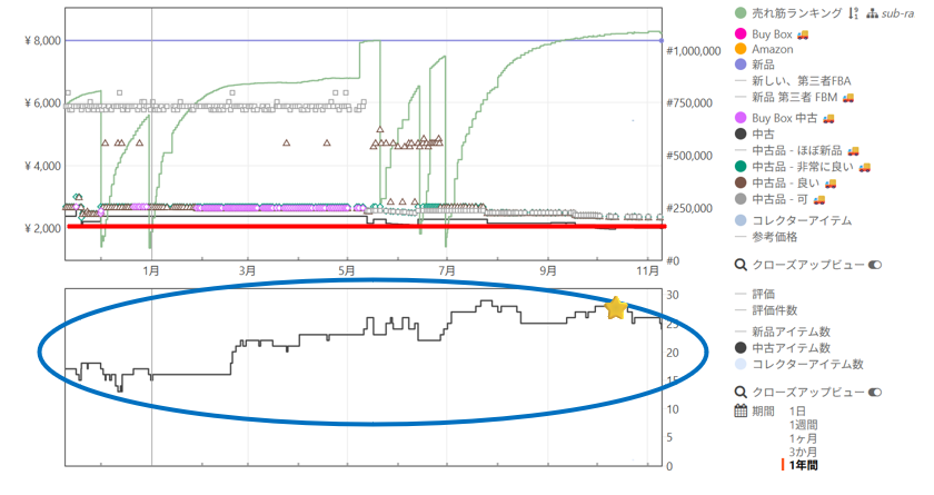 赤線を見ると、2,000円以上で安定的に売れていることがわかります。
