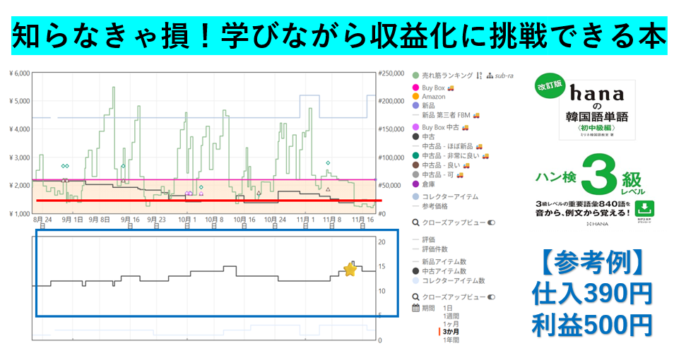 今回は僕が田舎で実践した副業せどりの体験談として、『改訂版 hanaの韓国語単語〈初中級編〉ハン検3級レベル』を例に紹介します。