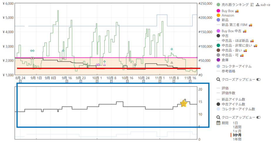 青枠を見ると 出品者が上下していて売れている可能性が高いことがわかります。