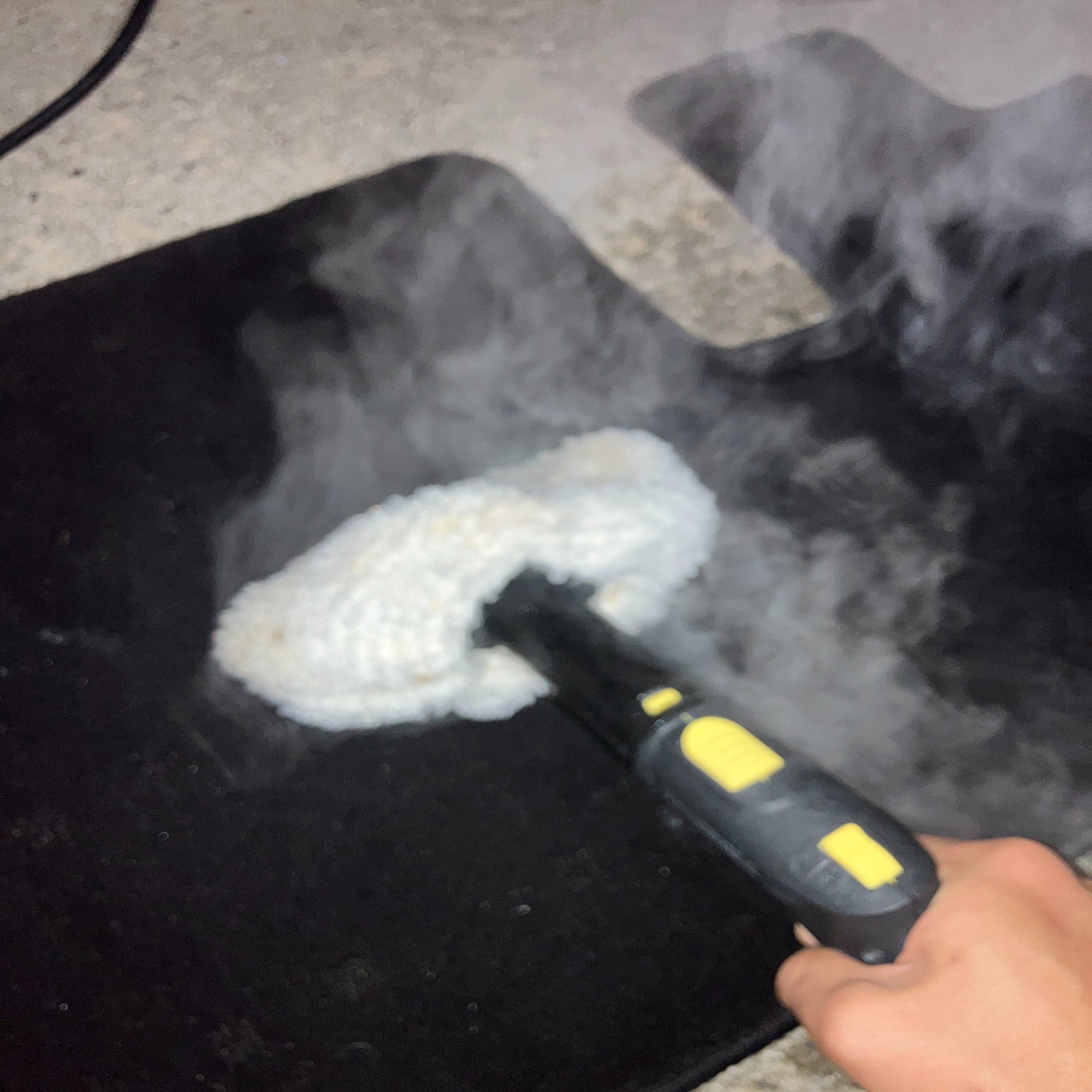 しかし、これだけでは、シートやマットの奥深くに染み込んだ匂いの原因菌は解決できません。ここからが、高温スチーマーの真価が問われます。