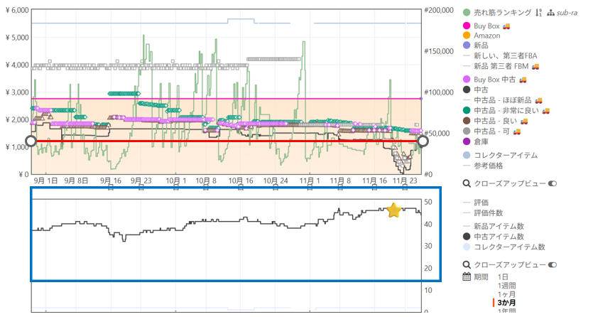 青枠を見ると 出品者が上下していて売れている可能性が高いことがわかります。
