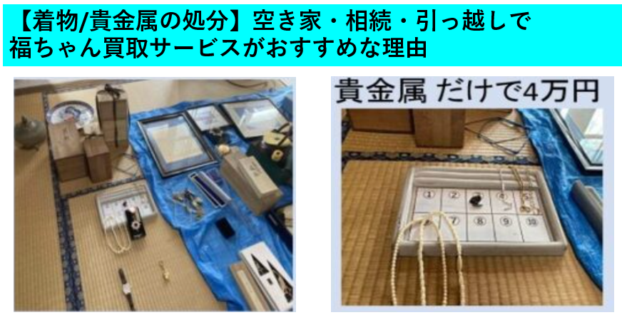 空き家再生のため残置物を引き取った際、古いネックレスや着物が山積みになっていました。最初は「捨てちゃおうか」とも思いましたが、念のため福ちゃんに見てもらうことに。