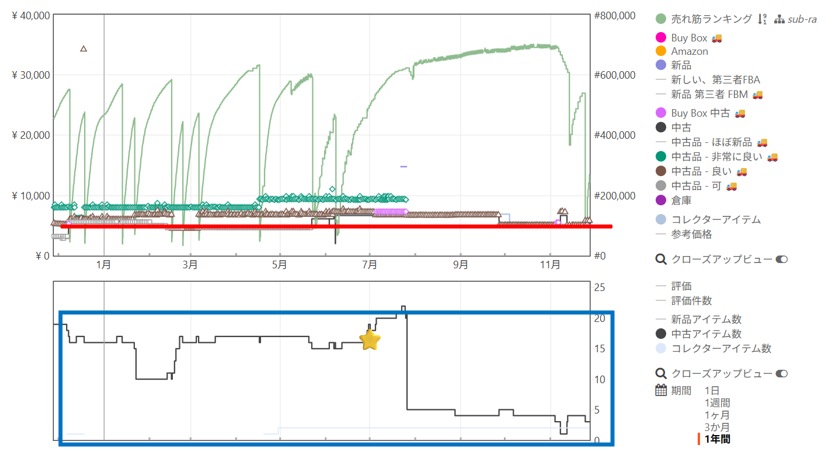 青枠を見ると 出品者が上下していて売れている可能性が高いことがわかります。