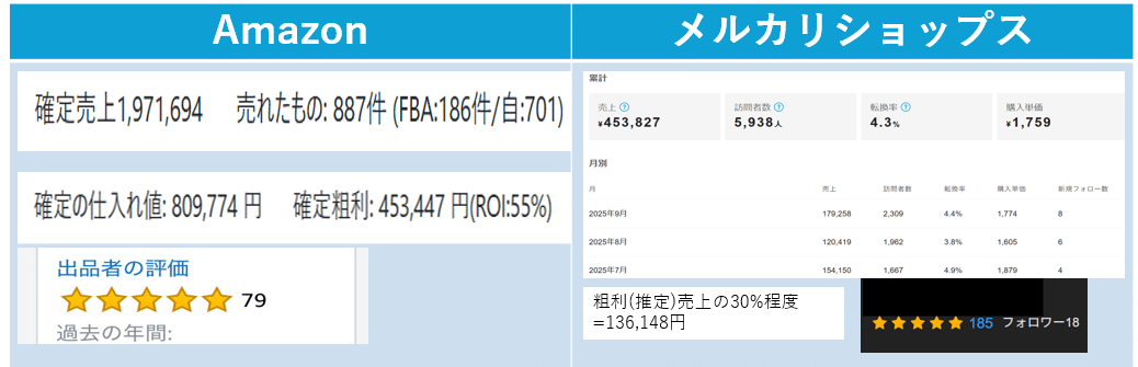 Amazonとメルカリショップスの3ヶ月の売り上げのエビデンスです。