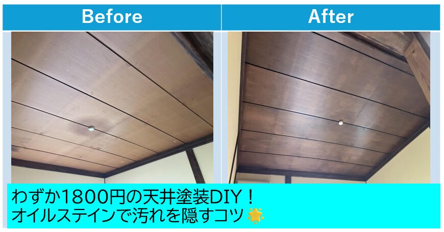 今回は築古物件の天井汚れやシミをオイルステインで塗装した実例を紹介しました
