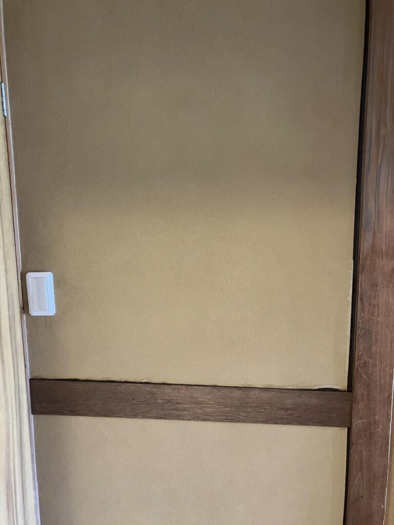 砂壁の質感をパテで再現するのはプロでも至難の業。しかし、オイルステインを塗ったベニヤ板を貼ると、まるで最初から「腰壁(こしかべ)」として設計されていたかのような、高級感のある仕上がりになります。築古物件特有の渋みと相性が良く、和モダンな内装へとバリューアップできます。