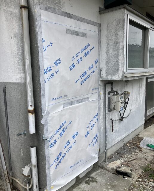 シートをタッカーで留め、端を防水テープで処理すれば、ひとまずの「壁化」は完了です!この上から後日、サイディングやガルバリウムなどの外壁材を施工していくことになります。