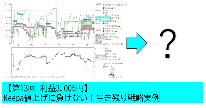 - ディフェンス 3割(低回転・高利益):今回のような専門書。売れるまで時間はかかりますが、1撃で利益額を大きく稼ぎ、純利を押し上げる役割。(利益目安やkeepaの波形は👉こちらをチェック)