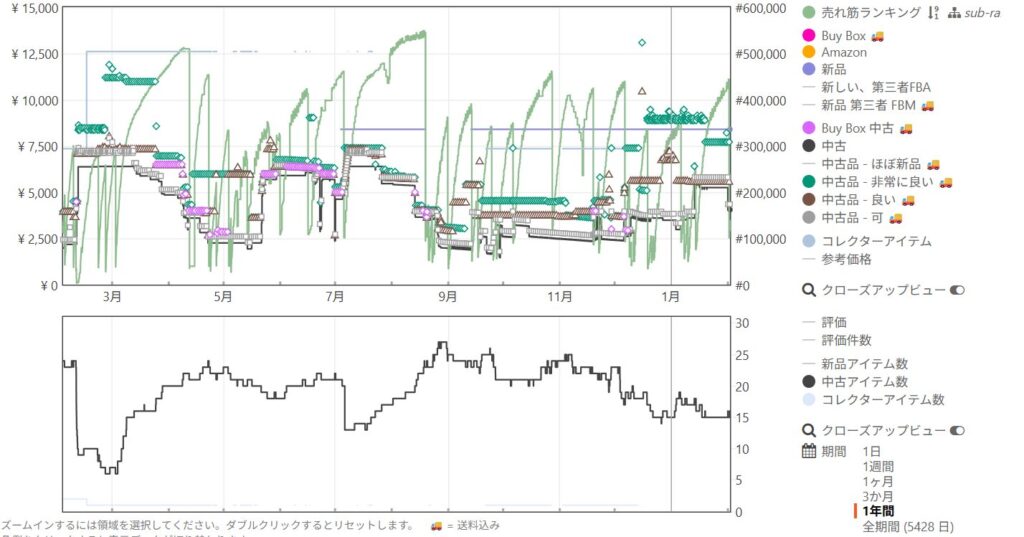 中古相場が定価に近い場合でも、ランキング波形がコンスタントに動いていれば、市場には十分な買い手がいます。Amazon本体が不在(オレンジ網掛けなし)であれば、中古出品者が相場に合わせた適正な値付けを行いやすくなります。