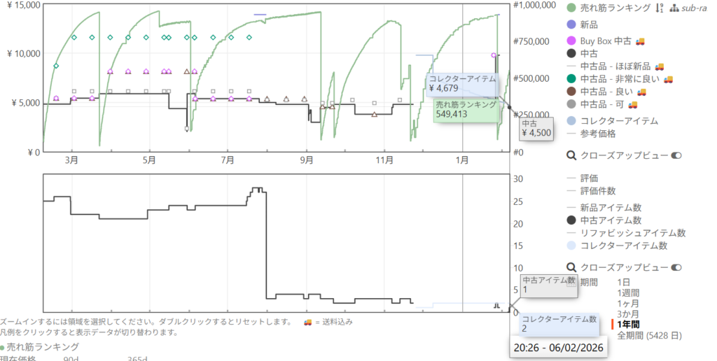 中古相場が定価に近い場合でも、ランキング波形がコンスタントに動いていれば、市場には十分な買い手がいます。Amazon本体が不在(オレンジ網掛けなし)であれば、中古出品者が相場に合わせた適正な値付けを行いやすくなります。