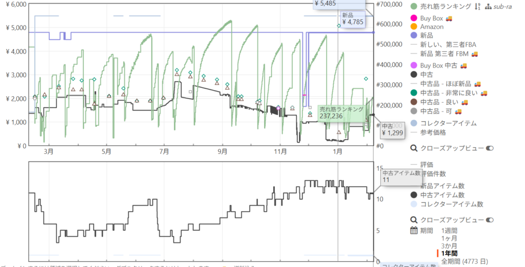 中古相場が定価に近い場合でも、ランキング波形がコンスタントに動いていれば、市場には十分な買い手がいます。Amazon本体が不在(オレンジ網掛けなし)であれば、中古出品者が相場に合わせた適正な値付けを行いやすくなります。