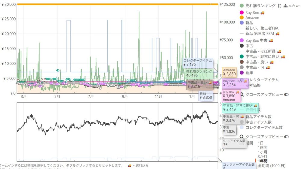 中古相場が定価に近い場合でも、ランキング波形がコンスタントに動いていれば、市場には十分な買い手がいます。Amazon本体が不在(オレンジ網掛けなし)であれば、中古出品者が相場に合わせた適正な値付けを行いやすくなります。