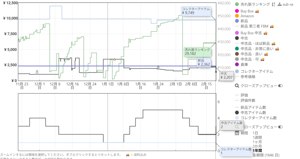 そこから1年後の価格や出品者数をみると、中古品せどりの面白さがわかります⭐