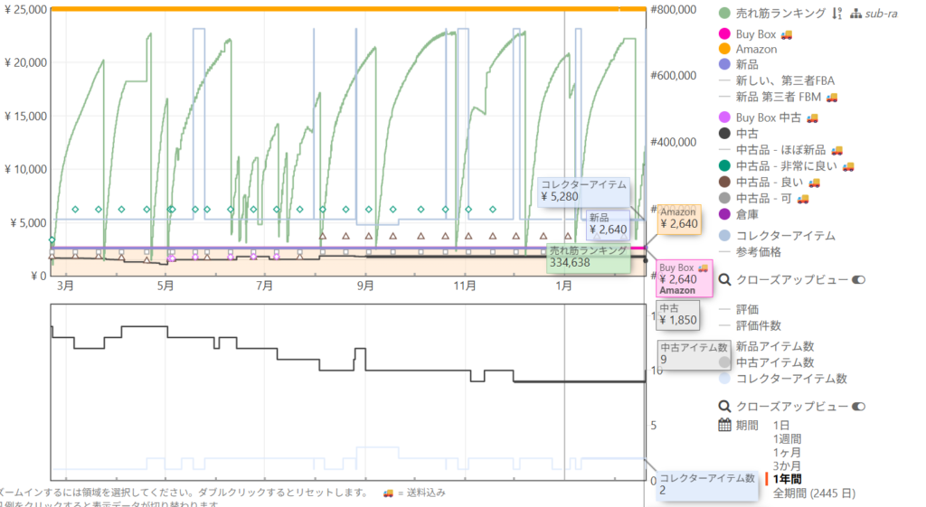 中古相場が定価に近い場合でも、ランキング波形がコンスタントに動いていれば、市場には十分な買い手がいます。Amazon本体が不在(オレンジ網掛けなし)であれば、中古出品者が相場に合わせた適正な値付けを行いやすくなります。