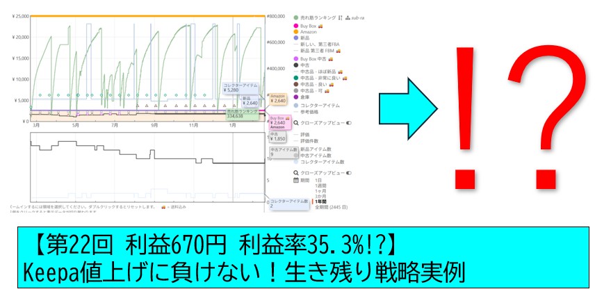 赤本、手芸、歴史、専門技術等の特定のジャンルや付属品は劣化が遅く、時には値上がる。Keepaで長期的な推移を見ると、一定の需要が継続していることがわかります。これこそが、単Cのみで1冊利益50円などの薄利多売から一歩抜け出し、安定した収益を支える「高利益(ディフェンス)」領域に繋がっていきます。