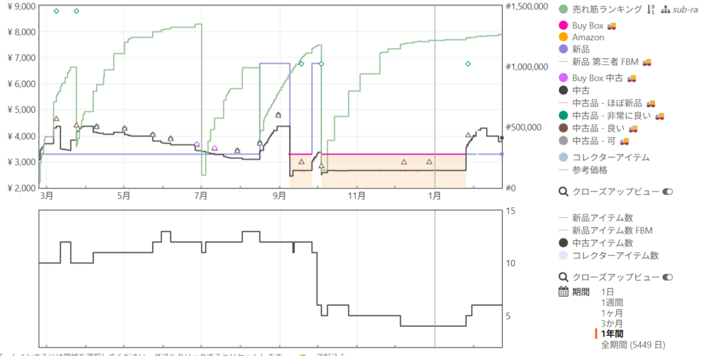 中古相場が定価に近い場合でも、ランキング波形がコンスタントに動いていれば、市場には十分な買い手がいます。Amazon本体が不在(オレンジ網掛けなし)であれば、中古出品者が相場に合わせた適正な値付けを行いやすくなります。