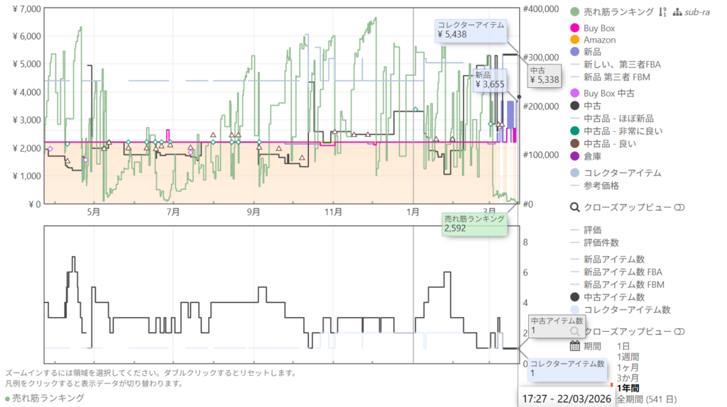 中古相場が定価に近い場合でも、ランキング波形がコンスタントに動いていれば、市場には十分な買い手がいます。Amazon本体が不在(オレンジ網掛けなし)であれば、中古出品者が相場に合わせた適正な値付けを行いやすくなります。