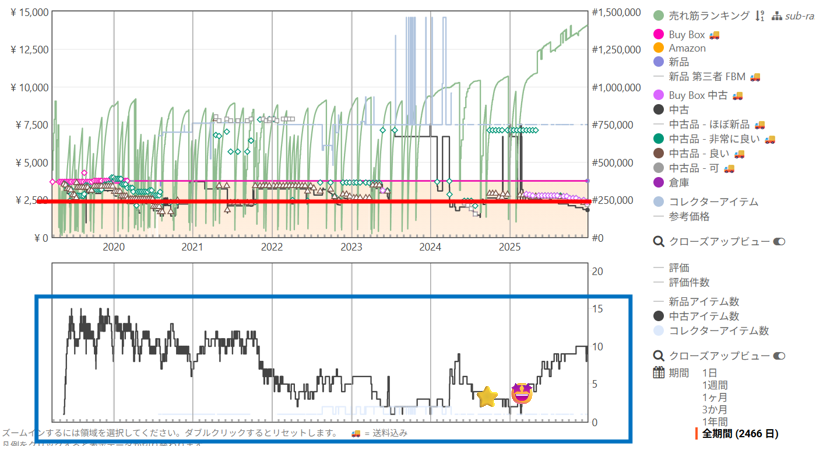 青枠を見ると 出品者が上下していて売れている可能性が高いことがわかります。