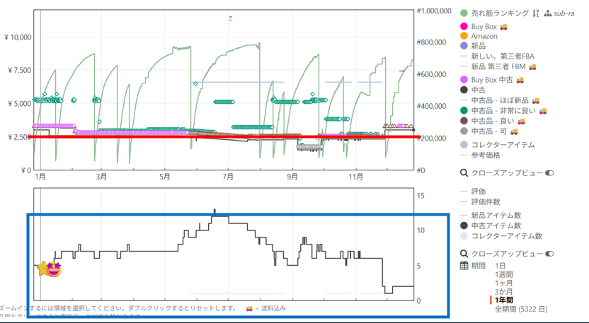 青枠を見ると 出品者が上下していて売れている可能性が高いことがわかります。