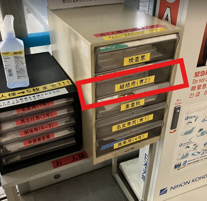 5番のユーザー車検側はこちら側の継続検査申請書を1枚とって手元の車検証をみながら記入します