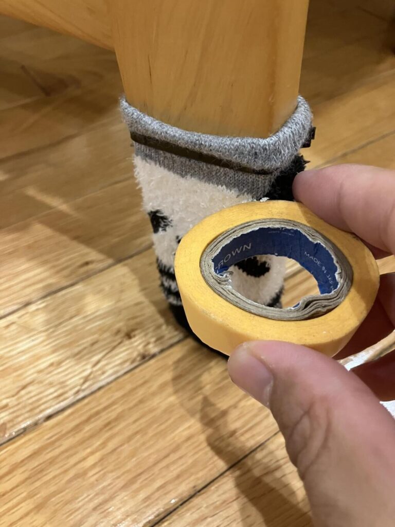 - マスキングテープで土台を作る: 椅子脚のソックスが止まってほしい位置に、マスキングテープを5〜10周ほど重ねて巻き付けます。これにより、わずかな「段差」が生まれます。
